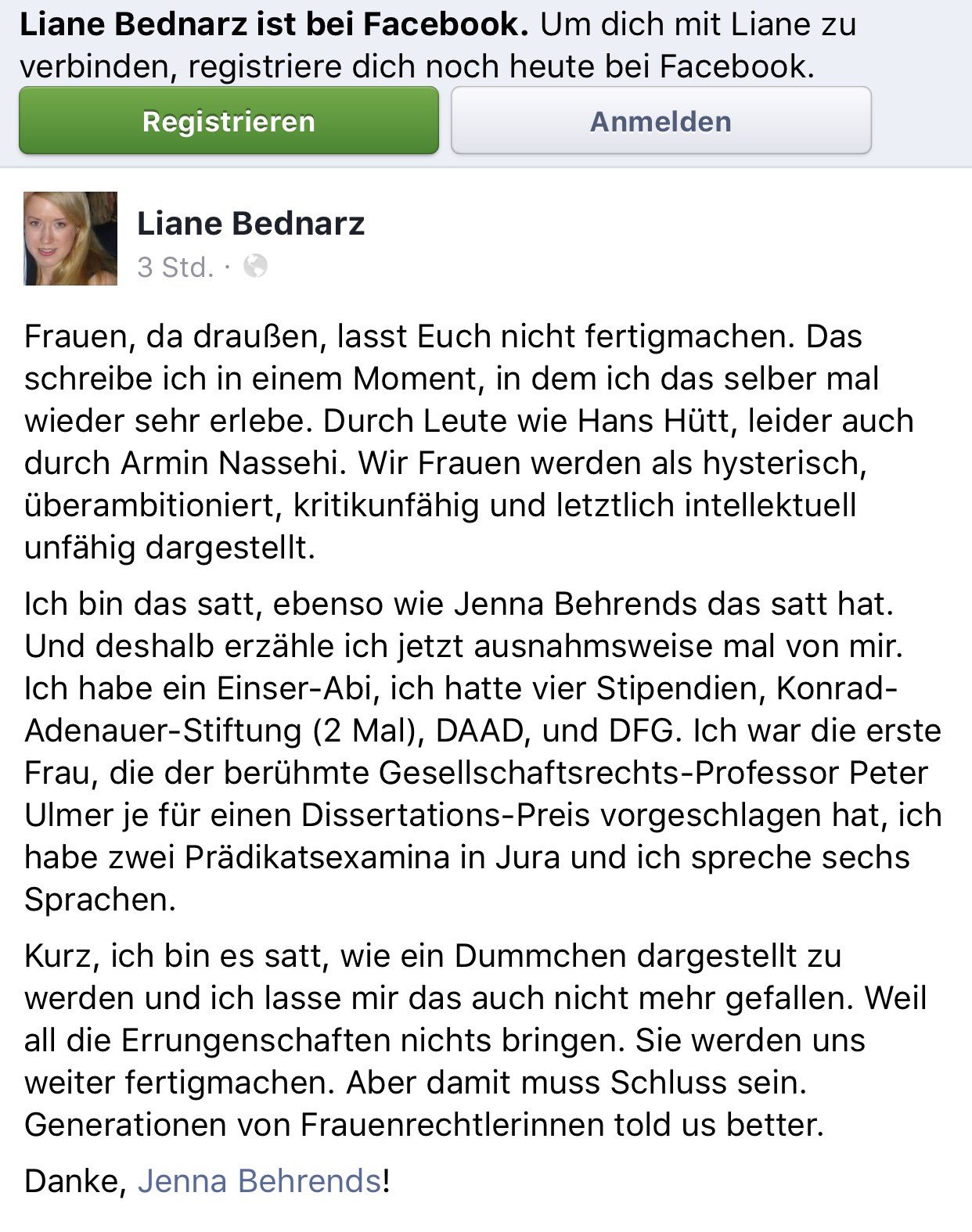 Dass Frl. Bednarz eigentlich hier beschäftigt ist, überrascht sehr: https://www.noerr.com/de/persoenlichkeiten/bednarz-liane.asp. Da kann man eigentlich nebenbei nicht auch noch im Kampf gegen Rechts aktiv sein; völlig unüblich in der Branche, denn da hat man bei so einem Job eine 70 Stunden Woche. Vielleicht wird Sie von interessierter Dritter Seite quersubventioniert.