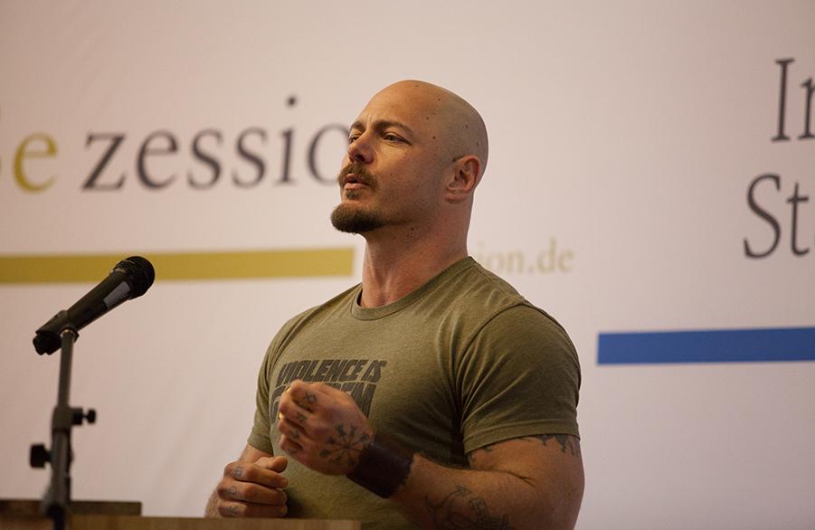 Mit solchen Stammesstrukturen als Möglichkeiten, einen Ausstieg aus dem ununterbrochenen Kreislauf eines Lebens im »Imperium des Nichts« zu schaffen, befaßt sich Donovans jüngstes Werk Becoming a Barbarian (wird derzeit für Antaios übersetzt). Seine Ansprache auf der “Gewalt”-Akademie war eng daran orientiert, und das nicht nur in der Art und Weise des Vortrags, dank der Donovan unter konsequenter Mißachtung der Mikrophone den Festsaal allein mit seiner dröhnenden Stimme zu erfüllen vermochte.